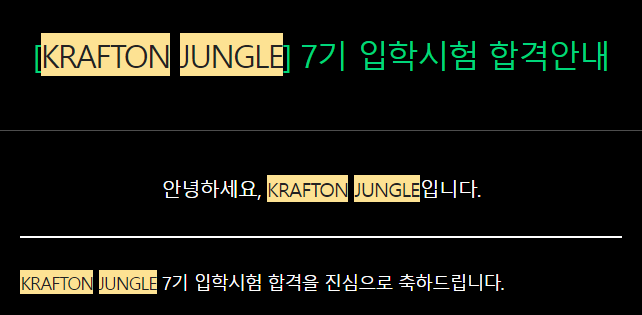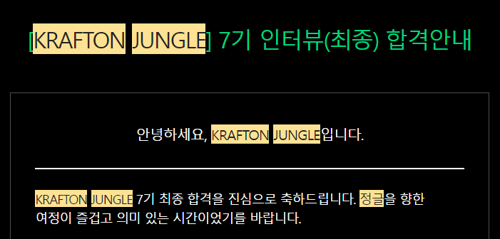 면접이 끝나고 다음 주에 바로 결과가 나왔다. 재지원하지 않겠다고 말씀드렸던 게 걸렸었는데 다행히 합격을 받을 수 있었다. 7기는 9월 2일부터 정글 모험을 시작하게 되는데, 시작하면 에너지를 다 쏟아보고 싶다.