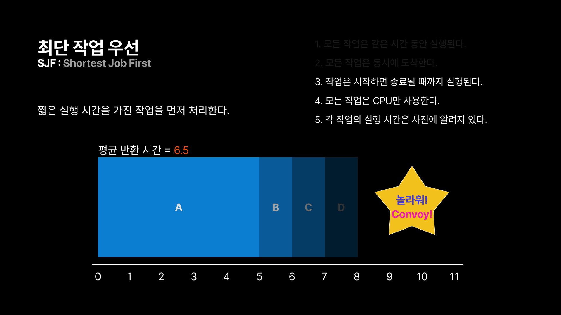 - 작업 시간 5초를 가지는 작업 A가 먼저 실행된다고 하면, 평균 반환 시간은 6.5초로 증가한다.