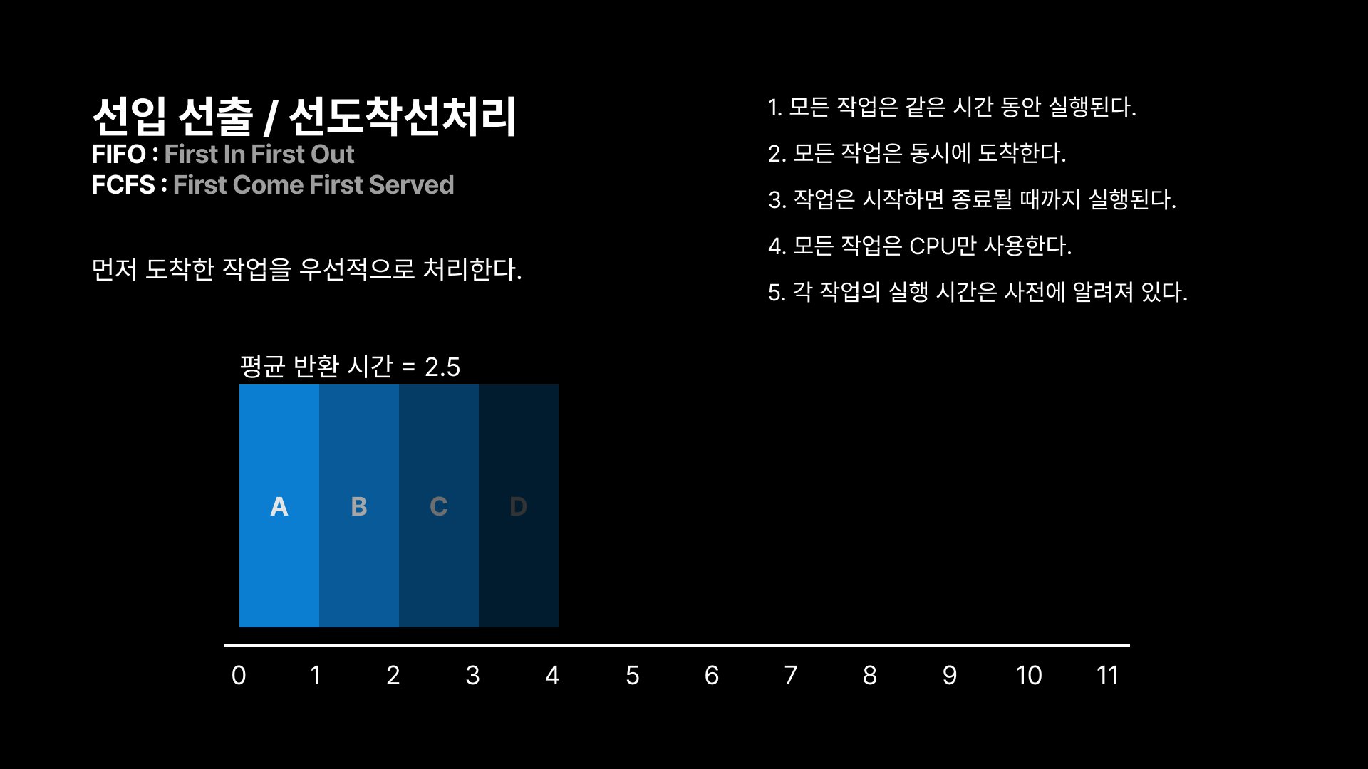 - 작업 A가 CPU를 점유하고 있는 상황에서 작업 B, C, D가 들어온다.
